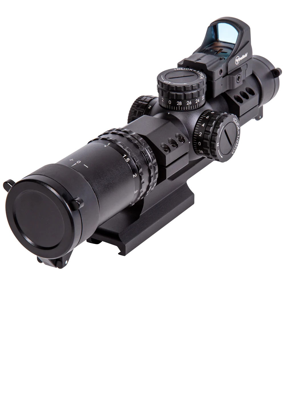 For a powerful, versatile riflescope look no further than the Firefield RapidStrike 1-4x24! This optic’s magnification range is ideal for hog and varmint hunting or 3-gun competition, and the included Impact Mini reflex sight ensures fast and accurate target acquisition. The RapidStrike 1-4x features a fully multi-coated lens and a red, green or black Circle Dot reticle with 5 brightness settings to accommodate your environment and target preferences. Housed in a durable aluminum body, the RapidStrike 1-4x is IP67 waterproof and dustproof, fog-proof, able to withstand up to .338 caliber recoil and capable of operating in temperatures ranging from -13F to 131F. Utilizing CR2032 batteries, the RapidStrike will function up to 100 hours and weighs a mere 13.8 ounces.